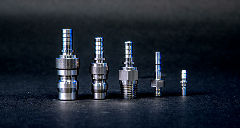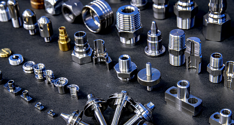ブランク加工後→ねじ、ローレット、六角穴、寸法精度品は研削、バリ取りなど。