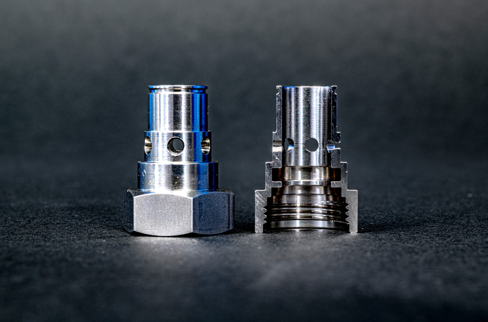 内径細目ねじ、複数段の座ぐり加工、内径ミゾの加工、工程の工夫と中圧クーラントにより切りくずの絡みもなく安定加工。