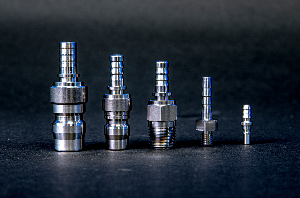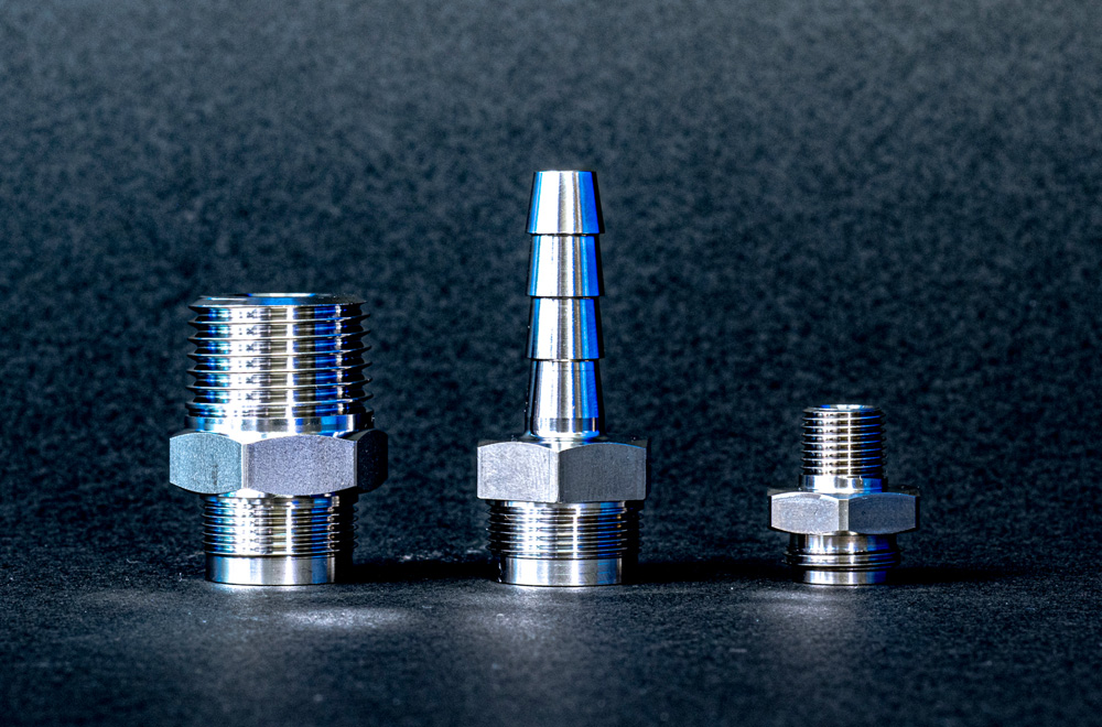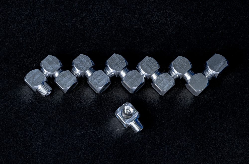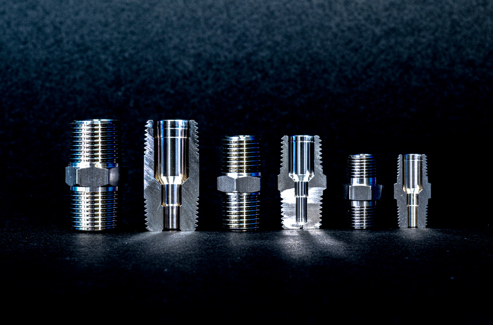 クロステーパーねじR(⅛)加工、外径R(⅛)テーパーねじ加工、丸材〜四角へミーリング加工、製品を繋げるとオブジェのようになります。
