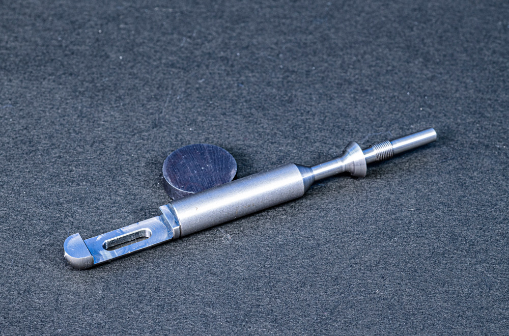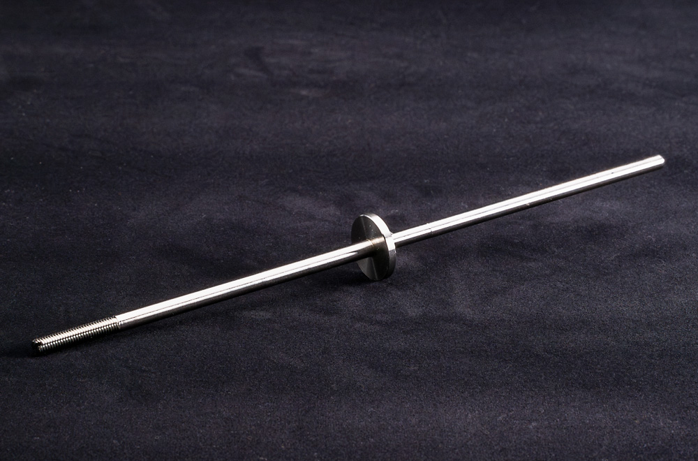 全長218mm、軸Φ5まで削り、片側M5ねじにスリ割り、もう片側はΦ4.8に先端フルR / 円盤にツバを残して両軸削り込み / 切り屑処理の工夫と機械の剛性が必要