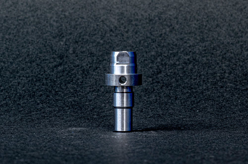 Φ25から先端Φ3±10μ / 両軸面粗度Rz1.6 / ツバ偏心穴 / 端面穴Φ3が深さ40mmクロス穴貫通 /コンベアから出てきたら完成品